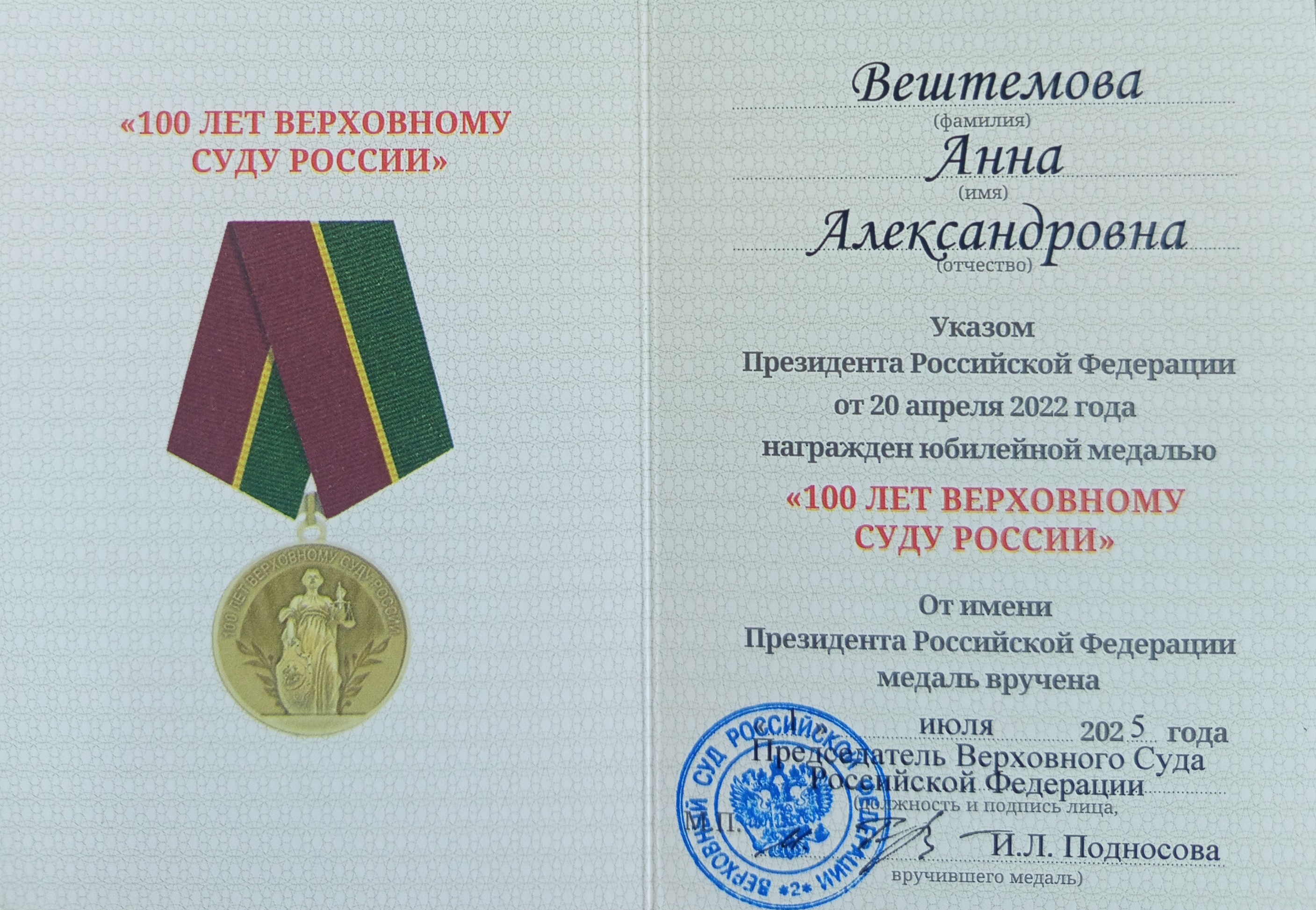 Указом Президента Российской Федерации от 20 апреля Медаль предназначена для судей, государственных служащих, внесших значительный вклад в укрепление правосудия. 26 января Коллеги искренне поздравляют Анну Александровну с получением награды и желают дальнейших успехов в профессиональной деятельности, здоровья и благополучия! ![]() |